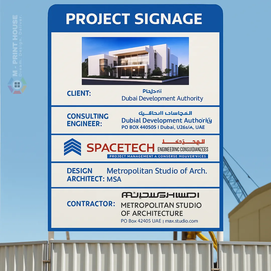 Durable, clear, and professional—Project Signage from M Print House UAE ensures safety, compliance, and effective project communication at construction sites.