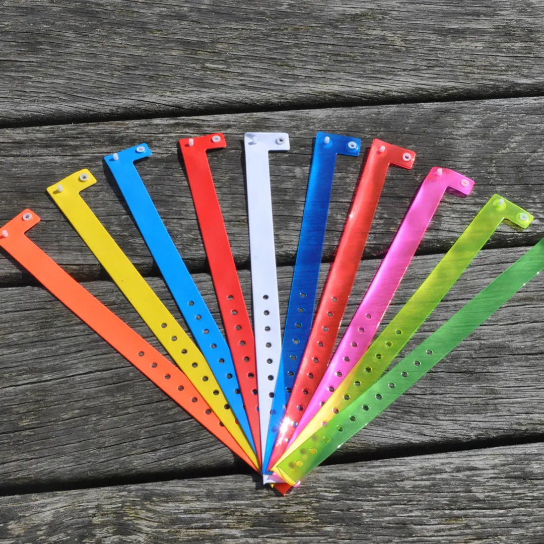 Available in a wide range of colors, styles, and printing options, vinyl wristbands can be plain, sequentially numbered, or fully customized with logos and text. They are single-use, secure wristbands, ensuring safety, reliability, and easy event management.