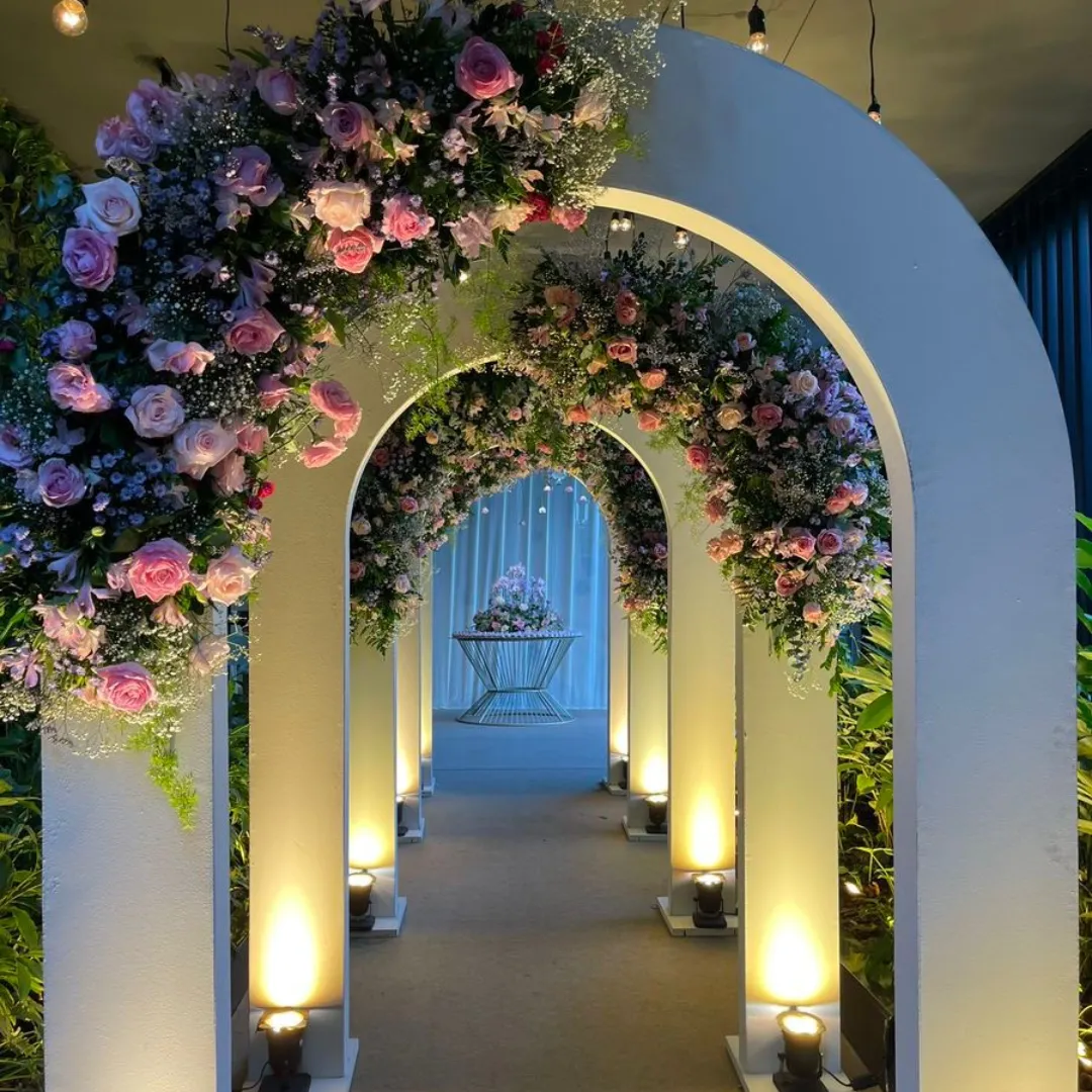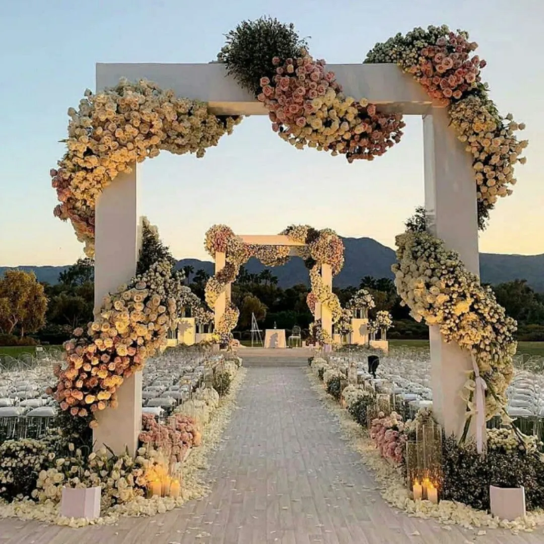 Our arches are crafted from durable frames (aluminum, steel, or wood) and decorated with flowers, fabrics, LED lights, or custom branding to perfectly match your wedding theme. Whether you prefer a round, square, or heart-shaped arch, we provide custom designs tailored to your style.